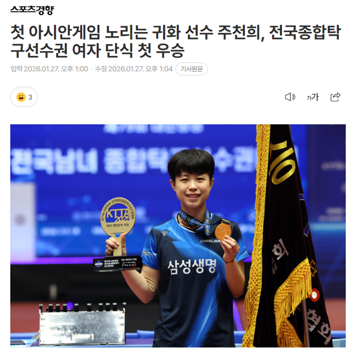 根据韩媒的报道,27岁的朱芊曦首次拿到韩国锦标赛的女单冠军,她将2026年9月的亚运会女单冠军视为目标。朱芊曦表示:今年将是我第一次代表韩国队出战亚运会,我真的很想拿到这枚金牌,今年自己还有一个目标是跻身世界前十。